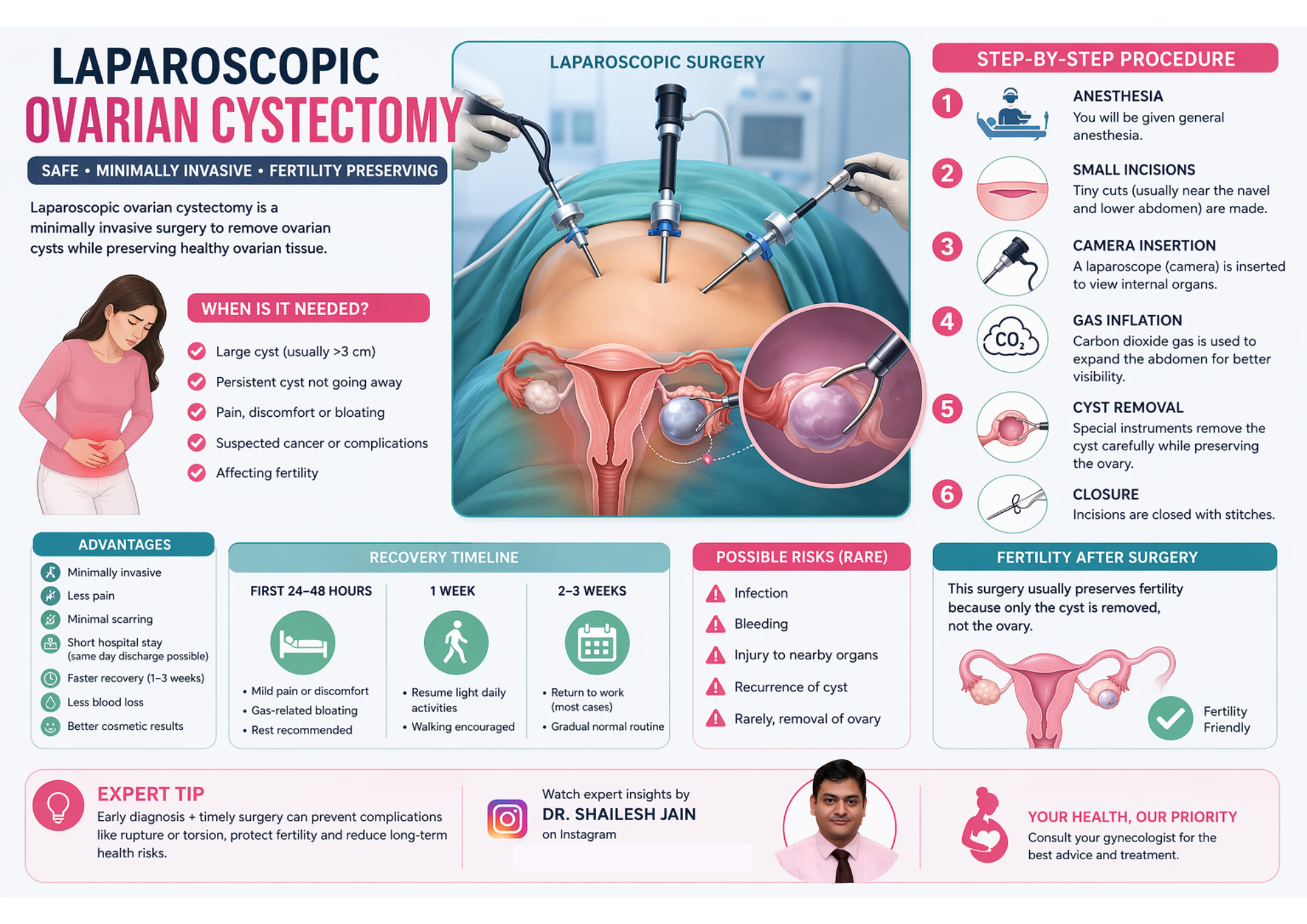 Laparoscopic ovarian cystectomy is a safe, advanced, and fertility-preserving procedure. If you are experiencing symptoms or have been diagnosed with an ovarian cyst, consult a specialist early for the best outcomes.